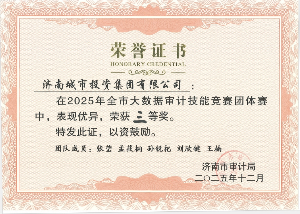 近日,濟南市審計局舉辦2025年全市大數據審計技能競賽決賽,濟南城投集團榮獲團隊賽三等獎。